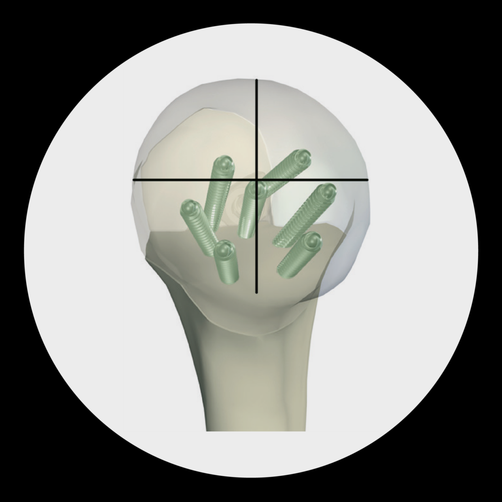 Tornillos divergentes de ángulo fijo (dirigidos a los cuadrantes inferiores) y tornillos de bloqueo poliaxiales que permiten una posición optimizada en la cabeza humeral.